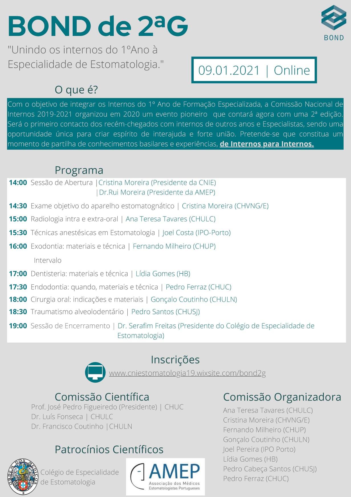 Com o objetivo de integrar os Internos do 1º Ano de Formação Especializada em Estomatologia, este evento pioneiro organizado pela Comissão Nacional de Internos de Estomatologia 2019-2021 conta agora com a sua 2ª edição em formato online devido à atual pandemia.